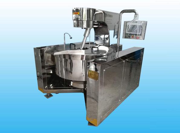 全自動電磁加熱行星攪拌炒鍋,此設備與常規電磁加熱炒鍋不同的是添加了自動注水裝置,在制作物料和清洗設備時比較方便;為了更準確的計算出一天所加工的產量,在設備上又添加了電子稱重模塊,計算出一鍋所加工的物料數量。