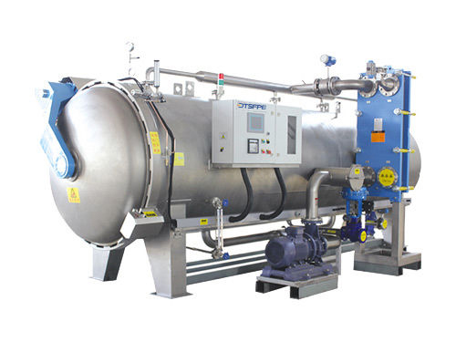 噴淋式殺菌鍋是注入少量工藝用水,達到預定位置(不能浸泡產品)通過高效循環泵-過濾器-高效換熱器將水注入到噴淋管道,然后通過噴淋嘴將熱水噴射出霧化狀至食品表面,鍋內熱分布均勻,無殺菌死角。水通過換熱器進行加熱和冷卻,升溫和冷卻速度迅速,能高效、全面、穩定的對產品進行殺菌。